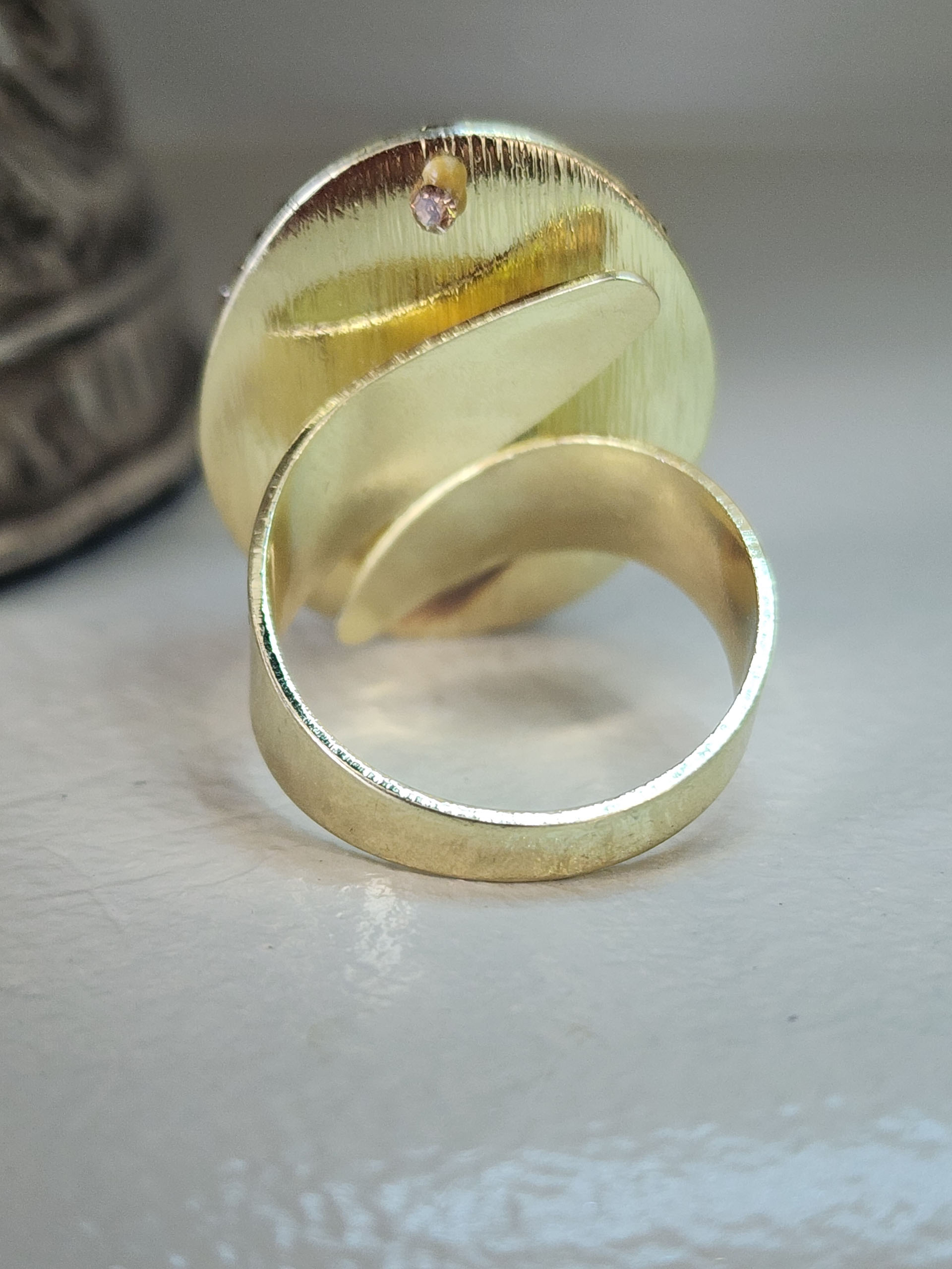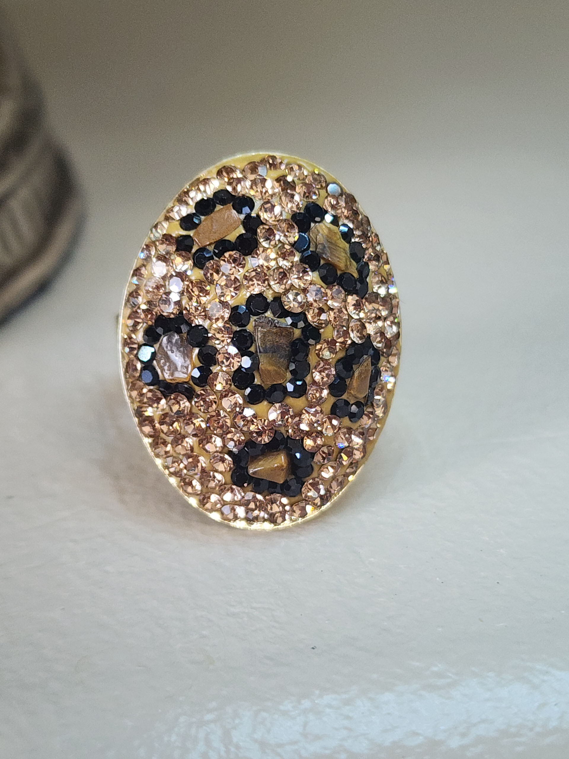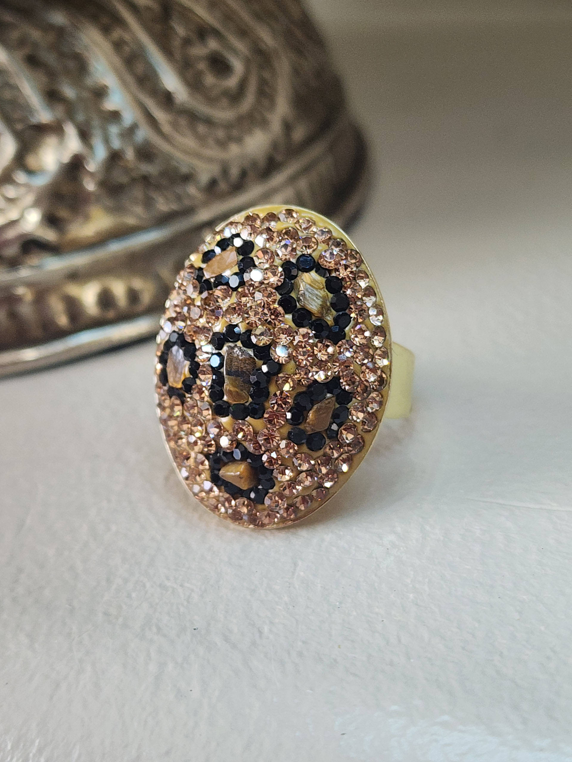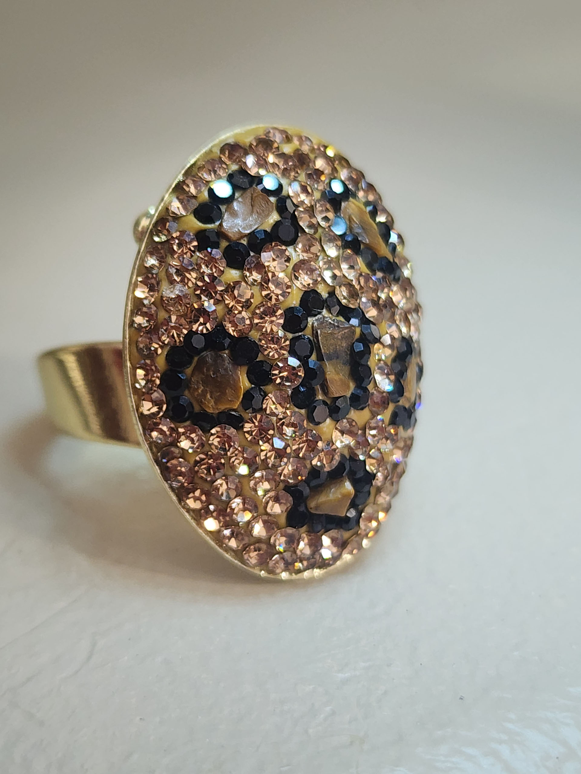 Embrace your wild side with the Brown Leopard Big Fun Adjustable Ring. This unique ring features a bold brown leopard design | beautifully complemented by a luxurious gold-plated finish. The adjustable band ensures a comfortable fit for any finger size | making it a perfect statement piece for any occasion. With its eye-catching design and quality materials | this ring is a must-have addition to your jewelry collection.